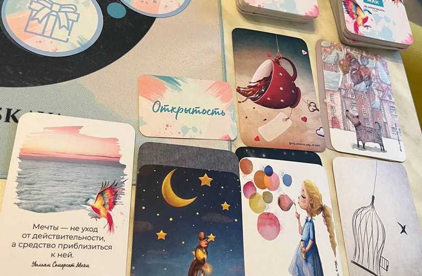- Работа с различными инструментами дополнительными инструментами (метафорическими картами, кубиками и пр).
