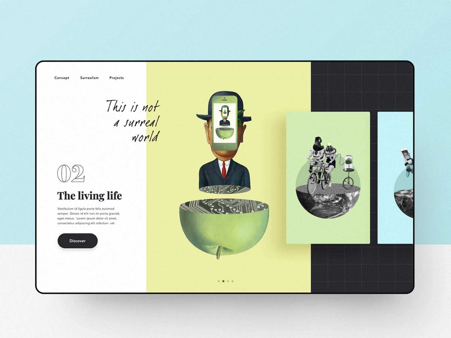 Это выбор нестандартных форм, фигур, изображений. Коллажи используют, чтобы разнообразить привычные шаблоны дизайна интерфейсов, сделать продукт запоминающимся.