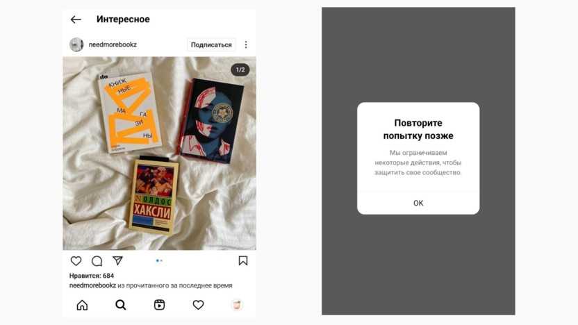 При нашей проверке ограничение на постановку лайков наступило после 800 лайков на аккаунте, который существовал более полугода. Аккаунт был заморожен за подобные действия на сутки – при этом осталась возможность оставлять комментарии и выкладывать посты и рилс.