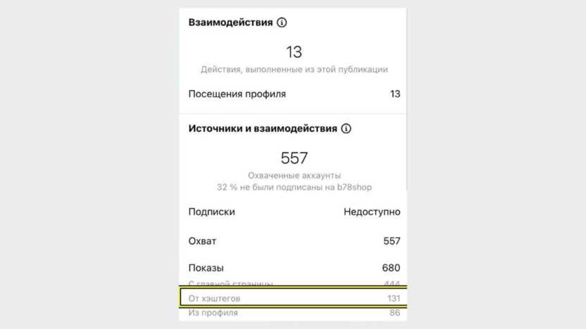 Сейчас в статистике Инстаграма количество охватов по хештегам не отображается, но еще год назад эти данные были. Например, вот показатели охвата с инстаграм-аккаунта магазина женской одежды – на популярных постах доля охватов с хештегов доходила до 20%.