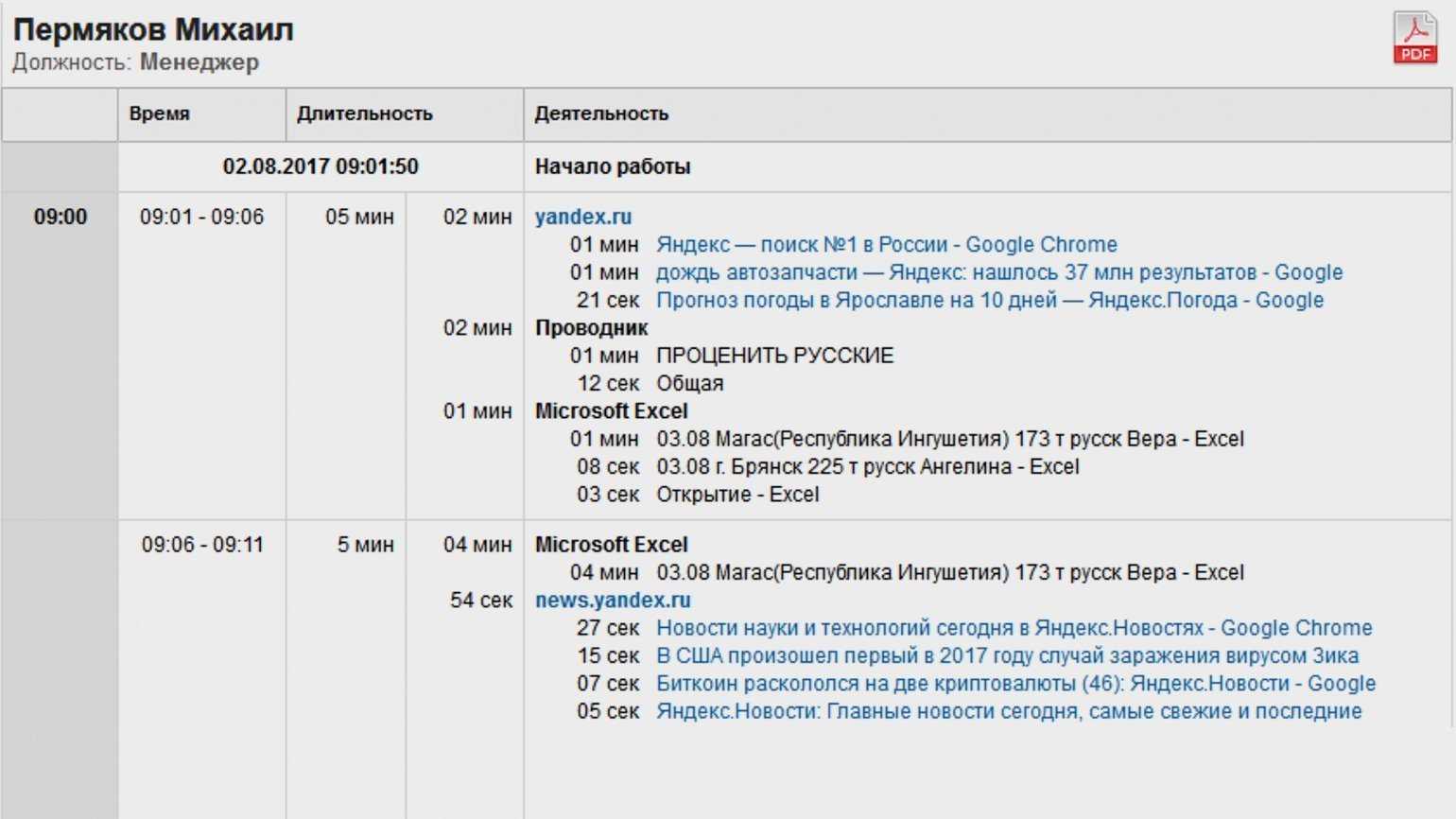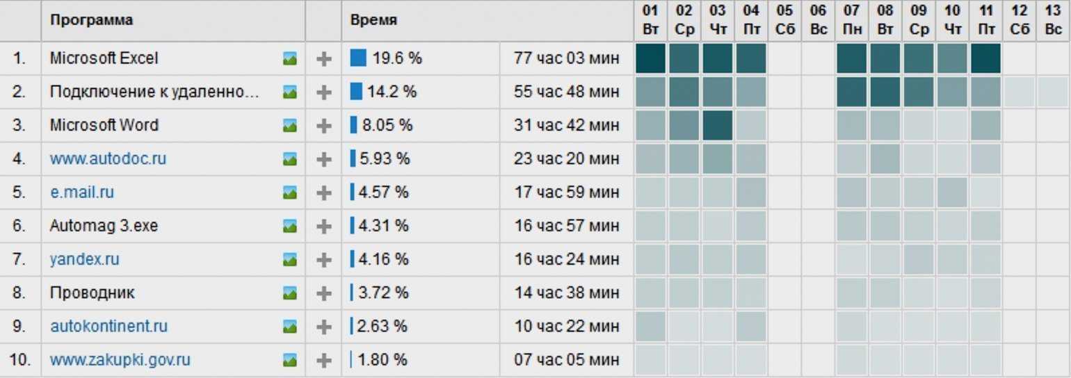 Система помогает отслеживать действия пользователей: вы сможете просматривать диаграмму с информацией о том, на каких сайтах больше всего проводят времени сотрудники. Также составляется перечень с программами, которые были запущены в рабочее время.