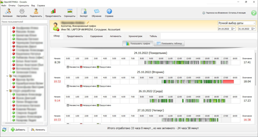 Приложение можно установить на компьютеры всех офисных и удаленных сотрудников. Есть возможность задать фиксированный или свободный график для подчиненных, указать количество рабочих часов и дней. Софт будет учитывать: