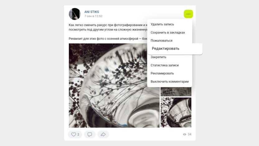 Редактировать посты можно в течение недели. Нажмите на три точки справа от названия страницы и кликните по соответствующему пункту. Можно изменить текст, перезалить файлы, сменить тематику – в общем, поменять все, кроме даты публикации.