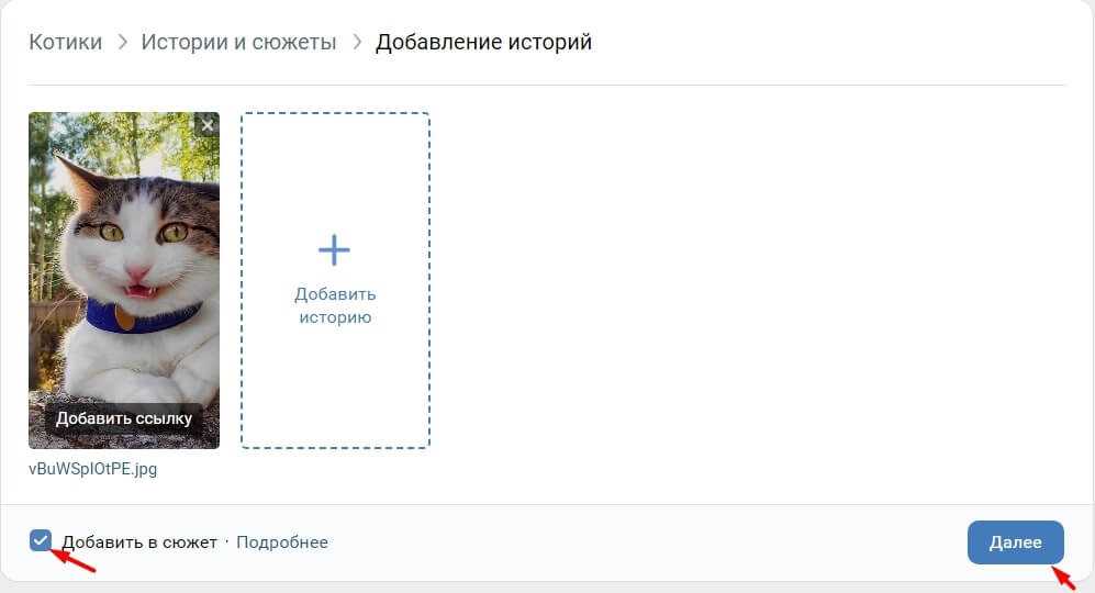 Историю можно сразу добавить в сюжет, если поставить галочку на соответствующем пункте, затем нажать на кнопку «Далее».