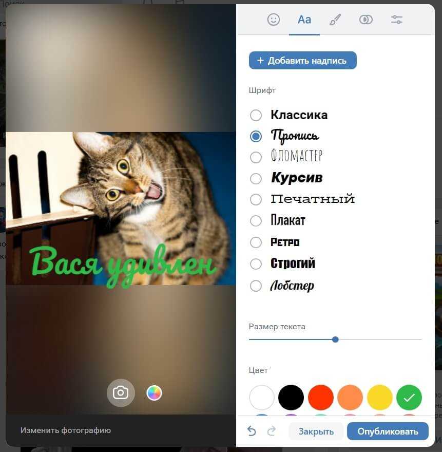 Надпись можно редактировать – менять ее содержание, цвет, шрифт, расположение и размер. Для примера введем текст «Вася удивлен», выберем шрифт «Пропись» и зеленый цвет, сдвинем надпись в нижнюю часть фото.