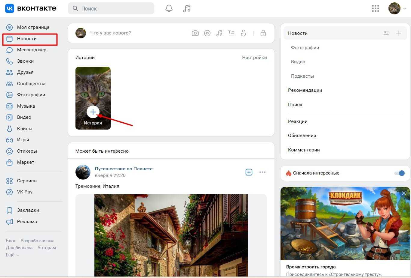 Авторизуйтесь на сайте vk.com, перейдите в раздел «Новости», найдите блок «Истории» и кликните по «+», расположенному поверх изображения аватара.