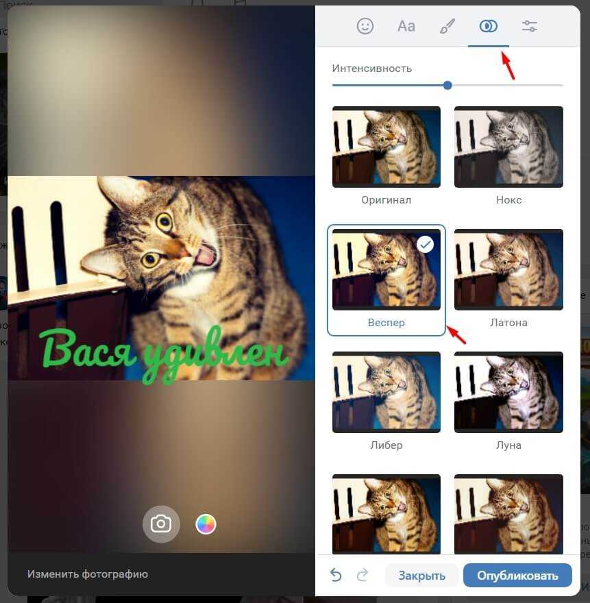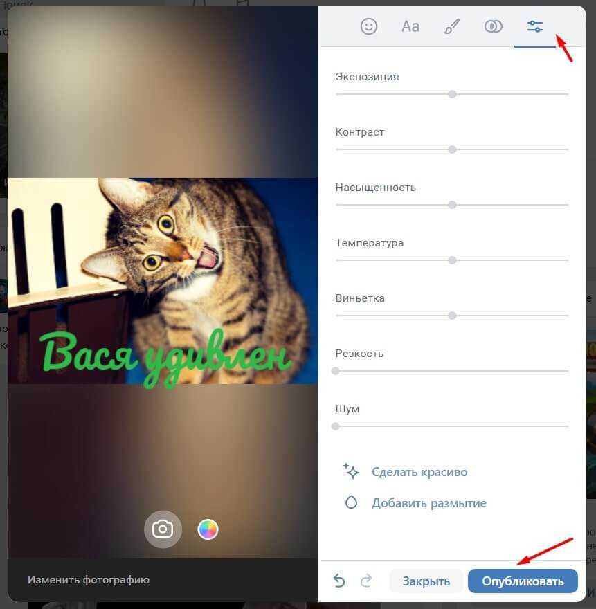 Можно также менять контрастность, резкость, насыщенность и другие параметры фото, добавлять размытие и пользоваться автоматической настройкой (сделать красиво). Чтобы сохранить изменения, нажмите на пункт «Изменить фотографию». Для размещения в историях нажмите на кнопку «Опубликовать».