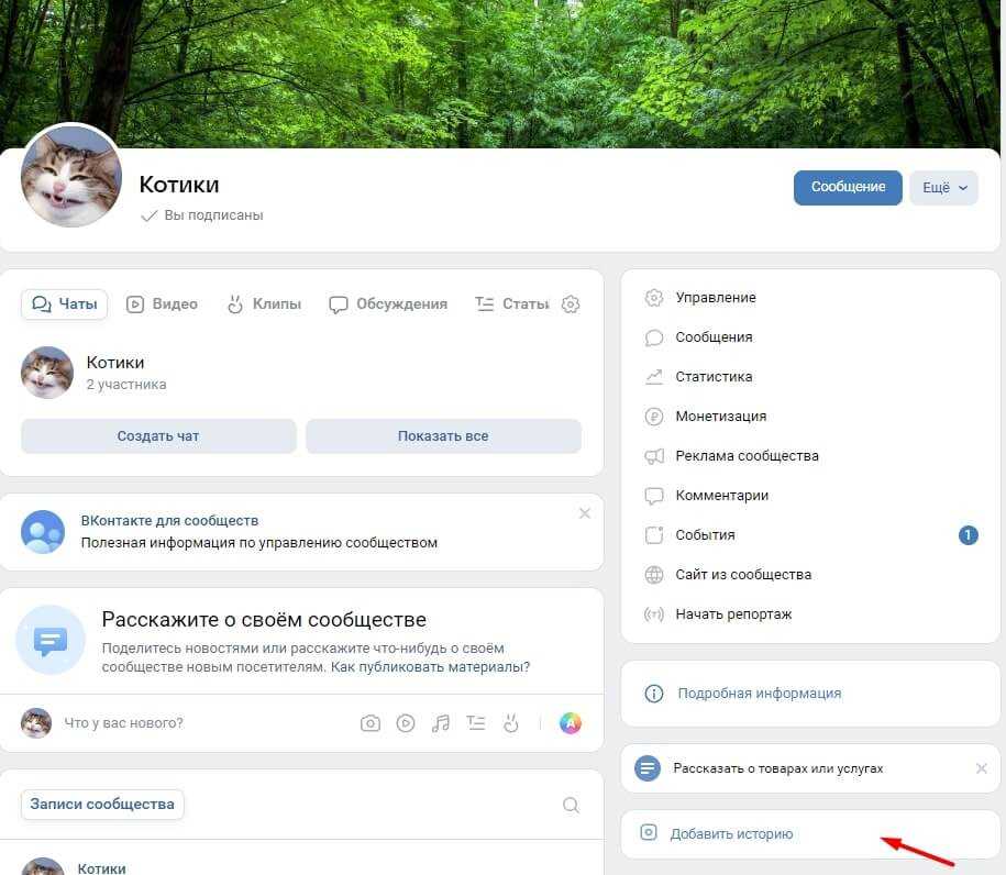 Войдите на страницу сообщества, владельцем или админом которого вы являетесь, и нажмите на пункт «Добавить историю».