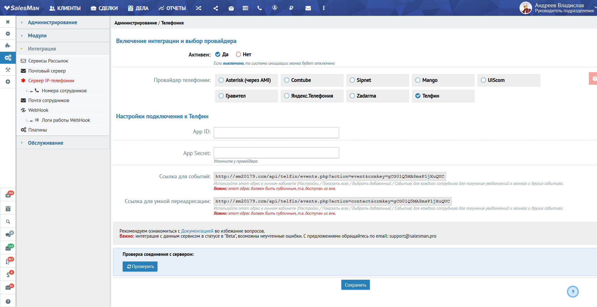 Настройка подключения в CRM проводятся в Панели управления. Здесь необходимо перейти в раздел «Интеграция» и выбрать Сервер ip-телефонии. Затем активировать функцию телефонии выбором меню «Использовать» и сервис «Телфин» в меню «Тип SIP».