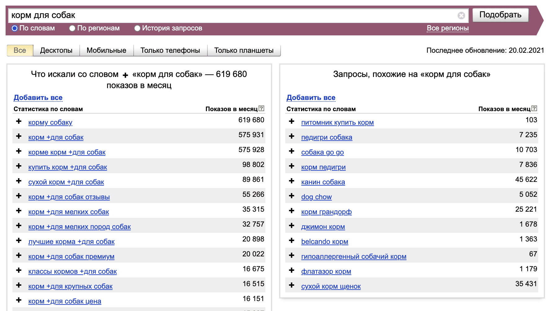 Семантическое ядро (СЯ) — это полный перечень всех поисковых запросов, по которым люди могут попасть на ваш сайт. Например, тот же корм для собак можно искать разными фразами: «купить корм для собак», «сухой корм для собак», «собачий корм цена» и так далее. Вариантов может быть очень много.