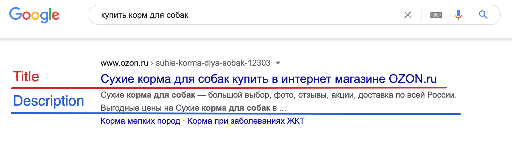 Title — это заголовок страницы в поисковой выдаче, description — ее описание. Эти теги должны цеплять, отражать суть страницы, побуждать перейти на нее, а также они должны быть оптимизированы под поисковые запросы.