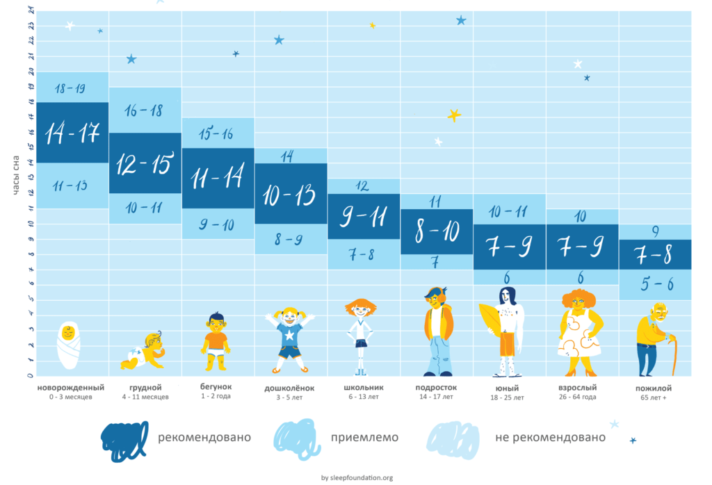 Чем младше ребёнок, тем больше его организм нуждается в сне. Младенцы сразу после рождения могут спать до 17 часов в день. На протяжении первого года жизни это время уменьшается в среднем до 14 часов. Пятилетние дети обычно чувствуют себя хорошо, если спят до одиннадцати часов ежедневно.