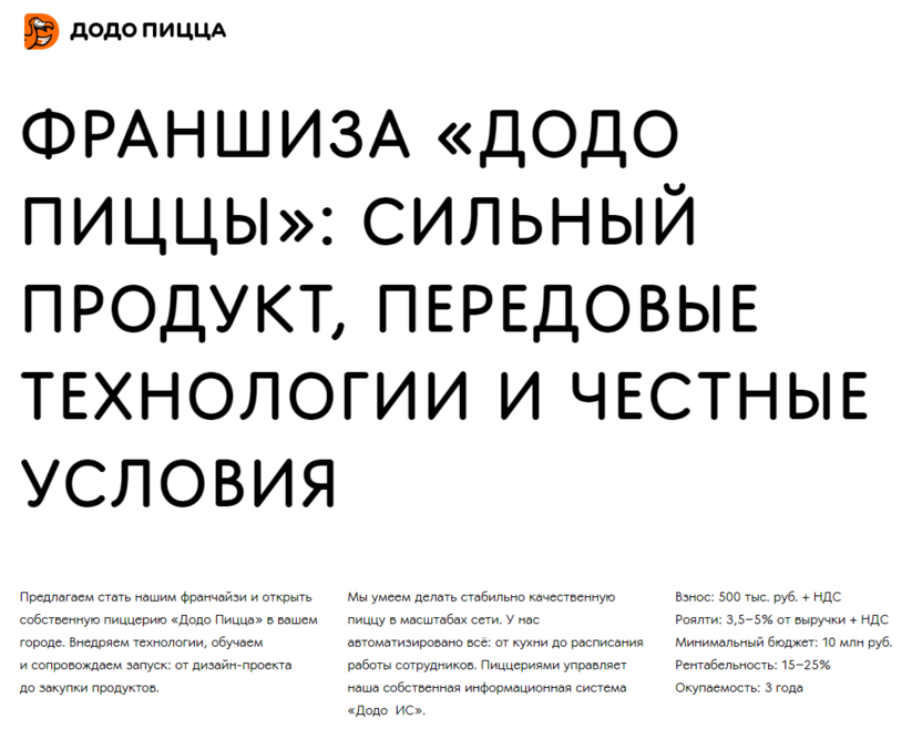 Предположим, предприниматель хочет открыть точку общепита, но опасается, что неизвестный бренд не сможет привлечь клиентов. Начинающий бизнесмен не знает, где закупать продукты и какое меню предложить посетителям, не понимает, сколько следует платить персоналу и т.д. Все эти вопросы решаются покупкой франшизы у известного бренда. Например, российская сеть ресторанов быстрого питания «Додо Пицца» предлагает стать франчайзи и открыть собственную пиццерию: