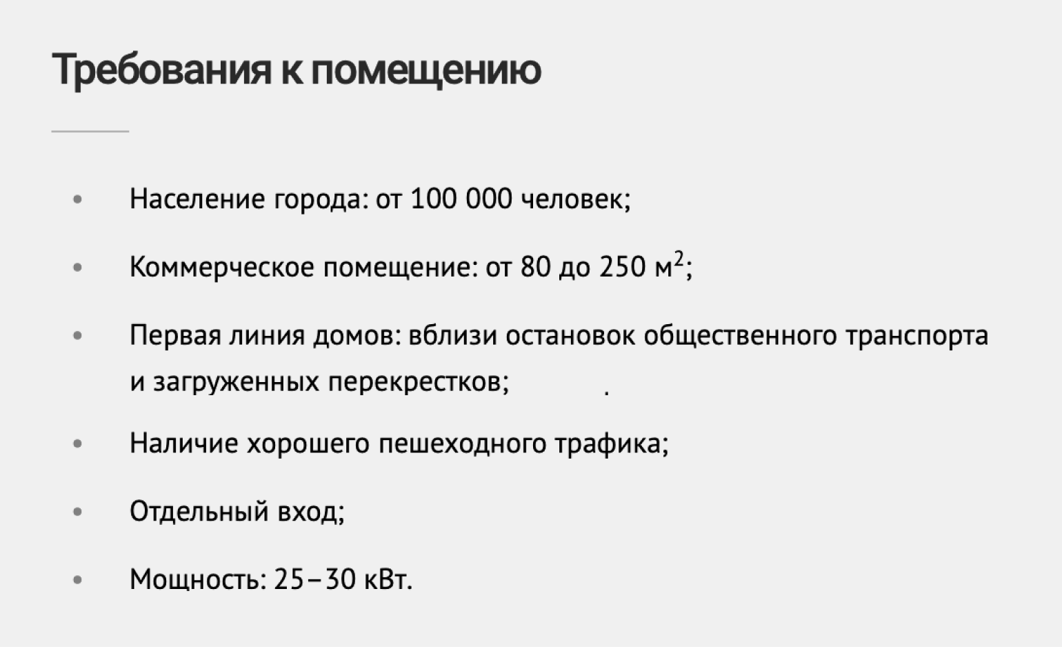 Франчайзер предоставляет бизнес-план и франчайзи-бук, оказывает помощь в подборе помещения, решает организационные и юридические вопросы. Строгие требования к покупателям франшизы отсутствуют. Главное — ответственное отношение к делу и готовность развивать бизнес.