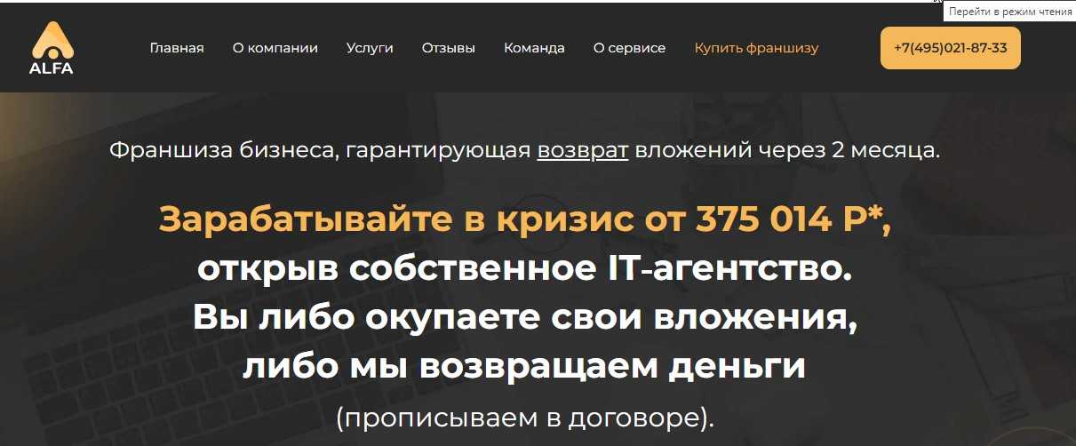 На главной странице веб-сайта франшизы ALFA речь идет о том, что можно открыть собственное IT-агентство и выйти на доход до 375 тысяч ежемесячно.