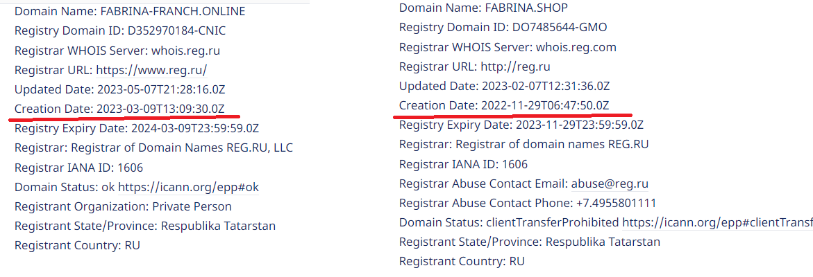 Заставляют сомневаться в таком количестве покупателей франшизы Фабрина и даты. На том же бизнес-портале датой основания франшизы значится 2021 г. Однако сведения о доменах опровергают это.