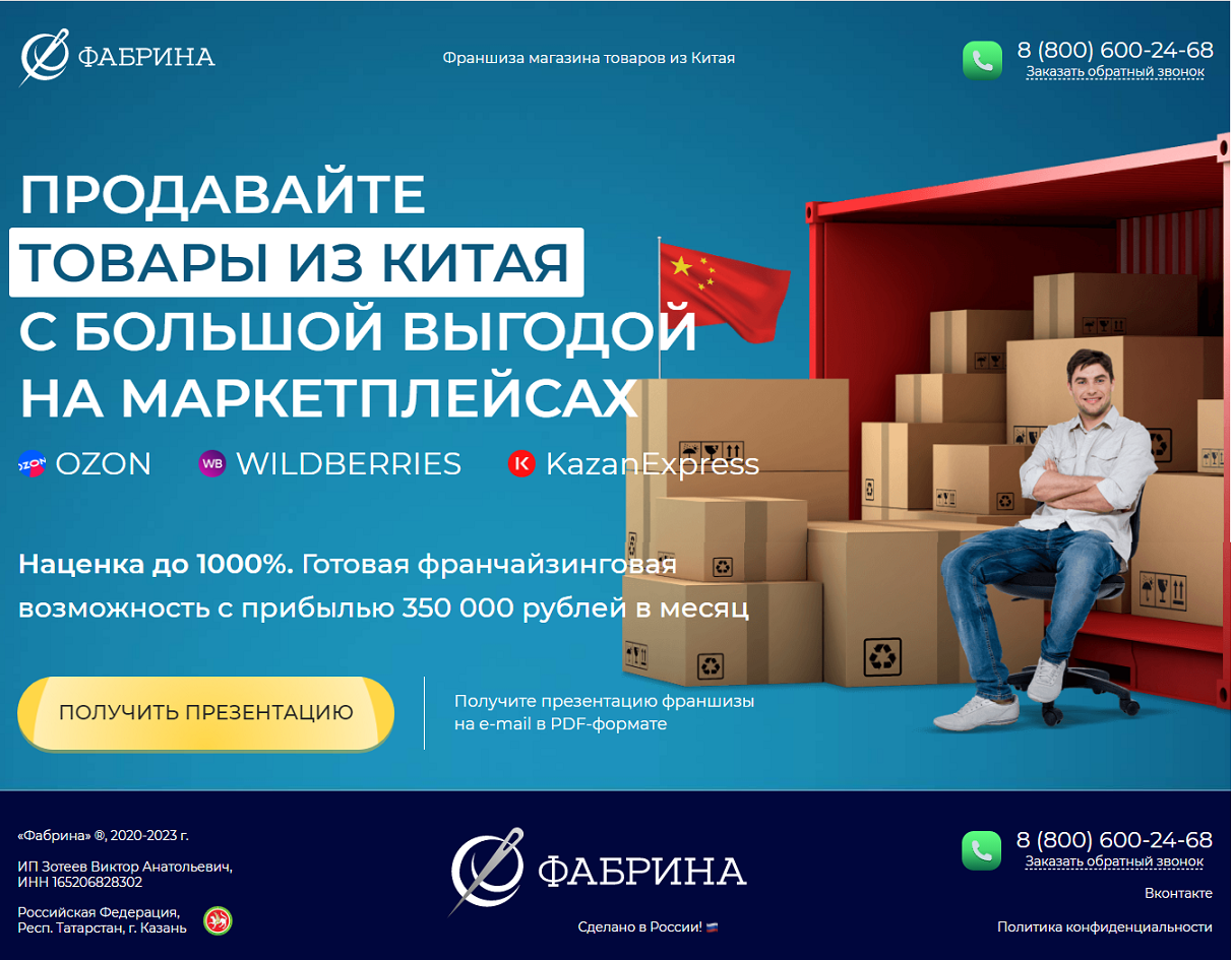 Правда, в этом всплывающем окне окажется и кле-что полезное – интернет-адрес основного проекта https://fabrina.shop/. Думаете, здесь расскажут о закупках товаров в Китае и продаже их на маркетплейсах в рамках франшизы Фабрина подробнее? Зря. Он посвящен швейному производству франчайзера (ИП Зотеева В.А.), так что на подробности о сверхприбыльном бизнесе и здесь рассчитывать не стоит.