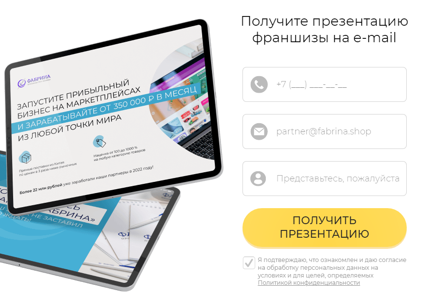 В ее полях нужно указать имя и контактные данные, согласиться на обработку информации в соответствии с политикой конфиденциальности. В результате, потенциального партнера-покупателя франшизы Фабрина поблагодарят и пообещают связаться в рабочее время (заниматься консультациями для будущих франчайзи в другие часы и дни никто не планирует).