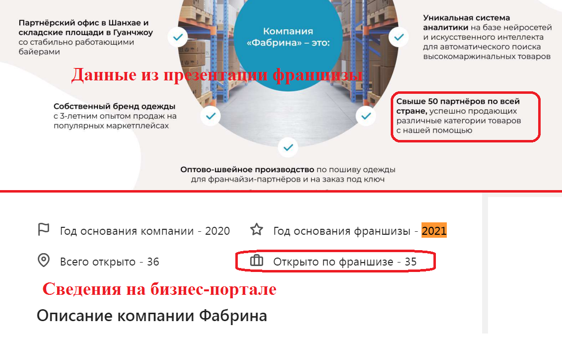 «Путается в показаниях» продавец франшизы Фабрина и когда речь заходит о действующих франчайзи. Начнем с того, что презентации он говорит о более чем 50 партнерах, а обновленные 27 апреля 2023 г. данные на Бизнесменс.ру говорят о 35.