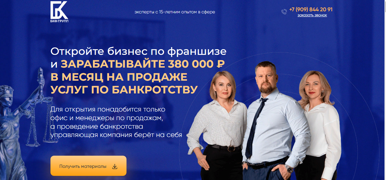 Веб-ресурс франшизы БКФ Групп выглядит презентабельно, что свойственно для таких проектов. На главной странице красуются сумма дохода и сотрудники компании.