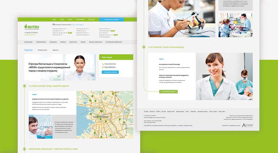 Поскольку клиники ИНТАН регулярно появляются в разных городах, то основная техническая фишка портала – это возможность добавлять полноценные разделы для каждого нового города. Раздел каждого города включает в себя контакты, услуги, цены, описание отдельных клиник, акции, списки врачей и даже информацию для потенциальных сотрудников: врачей, медсестер и администраторов клиник.