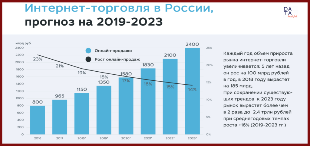 Прогноз роста интернет торговли на период с 2019 по 2023 год.