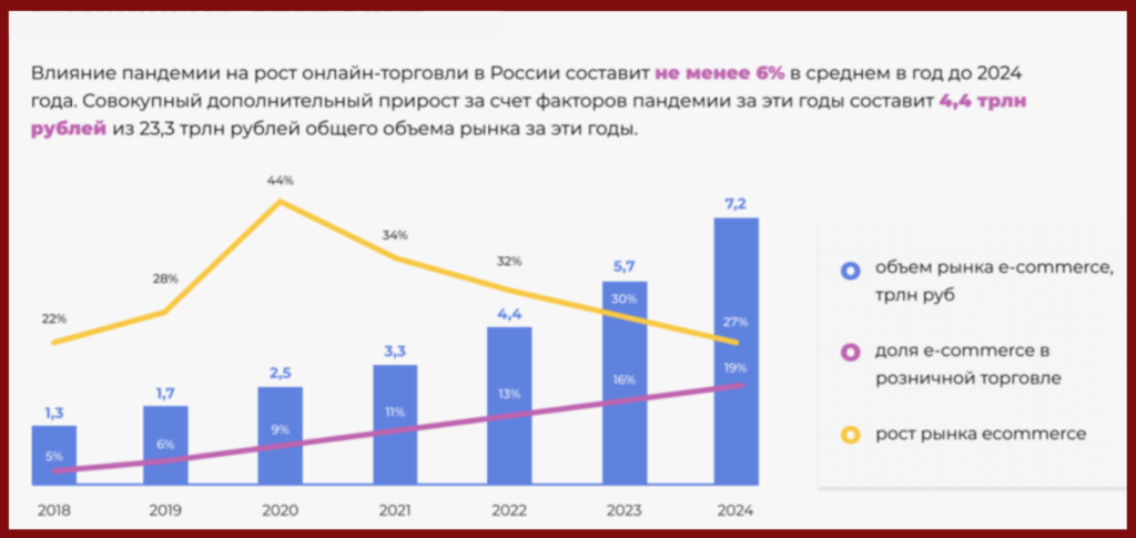 Самоизоляция повлияла на онлайн продажи. В онлайн торговлю пришло 10 млн. Как таковая изоляция исчезла, но привычка покупать в интернете осталась. Это увеличивает среднегодовую прибыль от интернет продаж до 33% процентов (было 28%). По мнению аналитиков, темп роста онлайн бизнеса поднимется до 33.2%, а объём продаж вырастет до 7.2 трлн рублей.