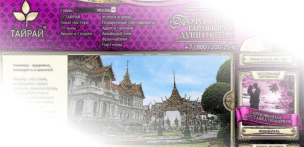 Франшиза салонов тайского массажа с 50-ю точками, расположенными по всей России. Данная сеть может предложить посетителю огромный выбор лечебно-оздоровительных и просто расслабляющих процедур: классический тайский, ойл и арома-массажи, массаж горячим маслом или травяными мешочками. Также в Whai Thai клиент может открыть для себя удивительный мир йоги. Еще имеется в наличии несколько видов Спа-процедур, в том числе и для двоих.