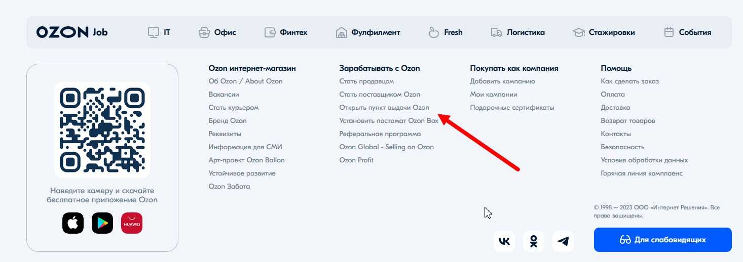 Для начала работы спускаемся в подвал сайта и находим пункт «Открыть пункт выдачи Ozon»: