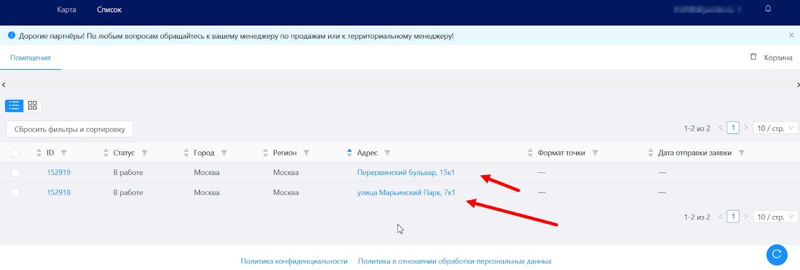 Нажимаем на адрес и переходим в меню создания заявки: