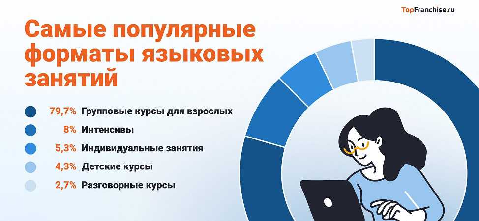 Наибольшим спросом в последние годы пользуются групповые занятия для взрослых. На втором месте — индивидуальное обучение, на третьем — языковые курсы для детей.