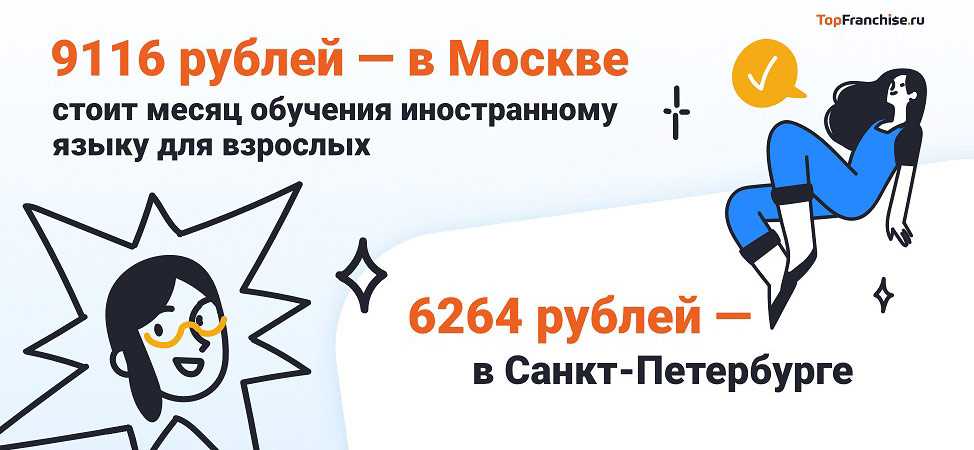 Если говорить о расценках, то средняя стоимость обучения в московской языковой школе для взрослых составляет 9116 рублей в месяц (по 2 занятия в неделю). Для сравнения, в Петербурге занятия по аналогичному графику обойдутся в 6264 рубля.