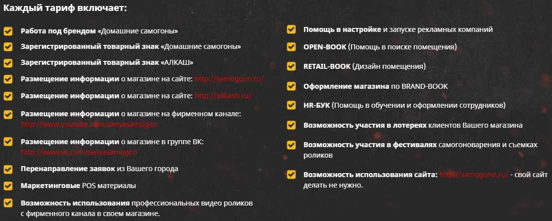 Изучив все отзывы франчайзи, стоит особенно отметить полную поддержку команды «Домашние Самогоны» в запуске бизнеса. Люди действительно благодарят руководителя Саню Самогона за инструкции по открытию, советы по избежанию рисков и общую поддержку при старте магазина. Что вы получаете при партнерстве с данной франшизой: