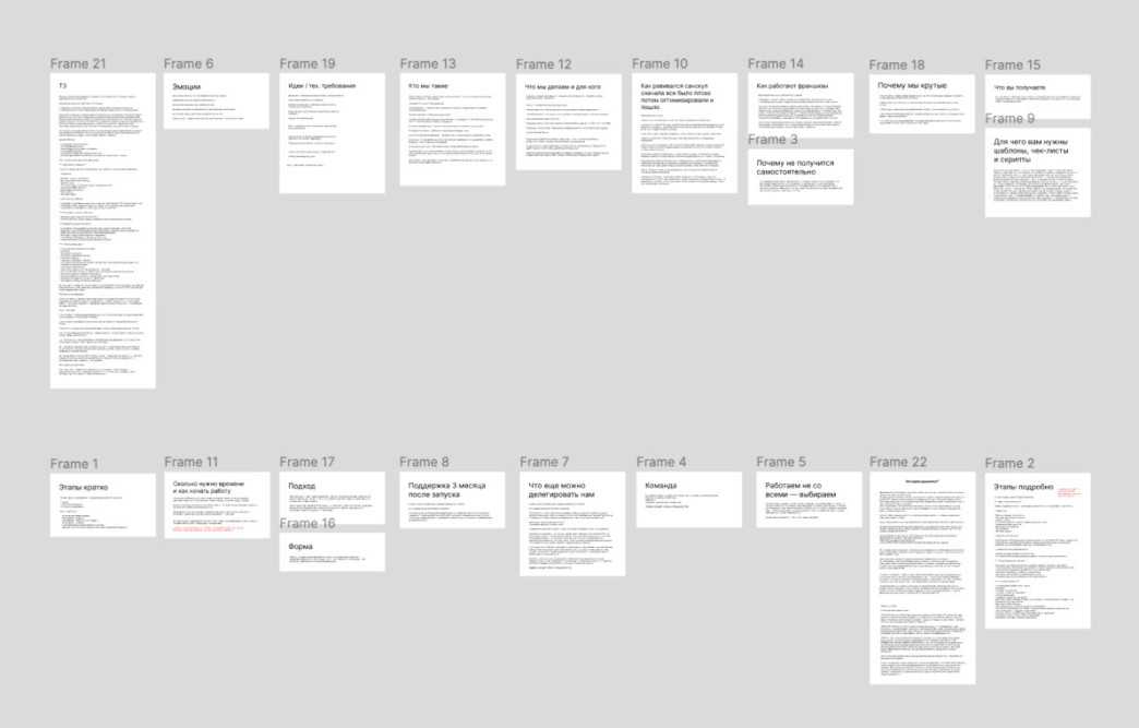 Работу над текстами мы начали с анализа конкурентов. Компаний, занимающихся упаковкой франшиз, довольно много, но все они до степени смешения похожи друг на друга: белый фон, много водного текста, мало фактов. Непонятно, как потенциальному пользователю выбрать между ними кого-то: все пишут об одном и том же и даже выглядят почти одинаково.