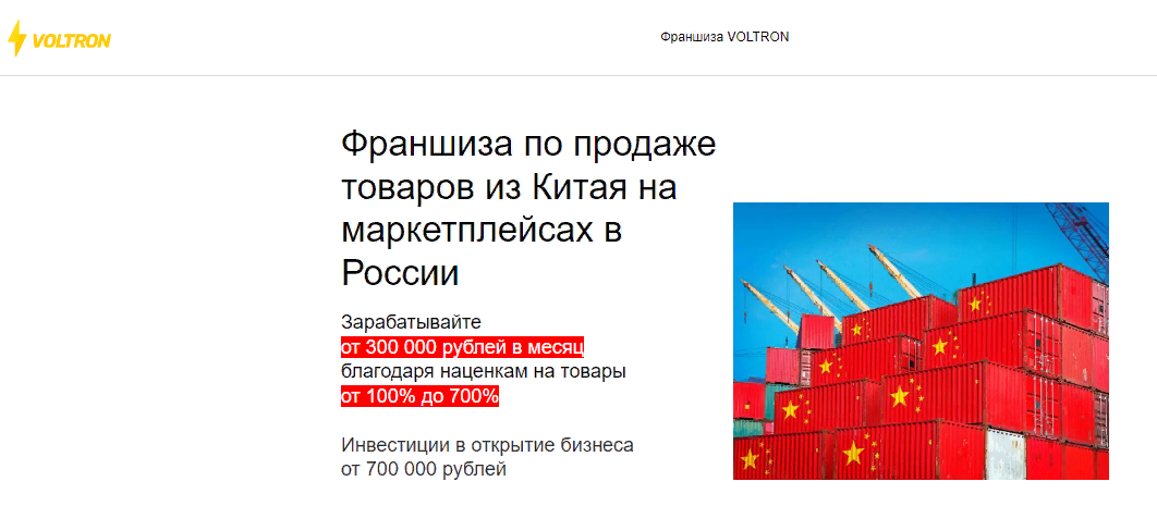 Все, что может понять пользователь — перед ним сайт франшизы по продаже товаров из Китая. Компания предлагает неплохой доход благодаря наценке от 100 до 700%.