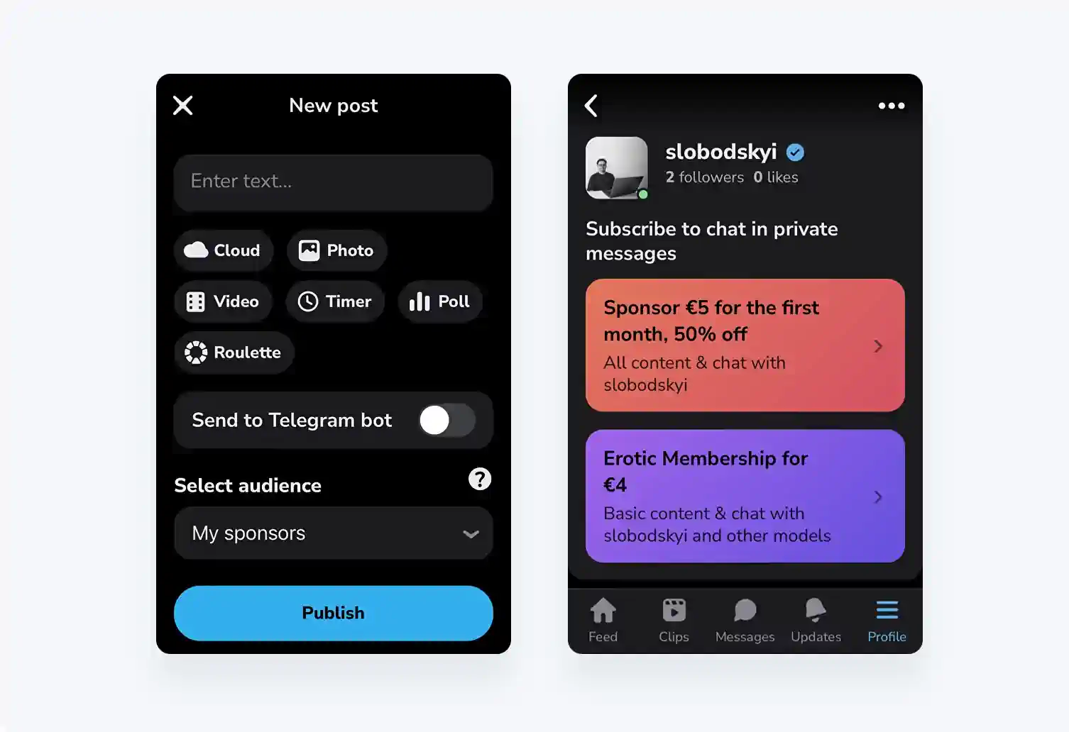 - Everyone (Free post): такая публикация будет доступна всем без ограничений. Здесь можно публиковать вовлекающий, но не очень откровенный контент. Такие публикации могут попасть в рекомендации.