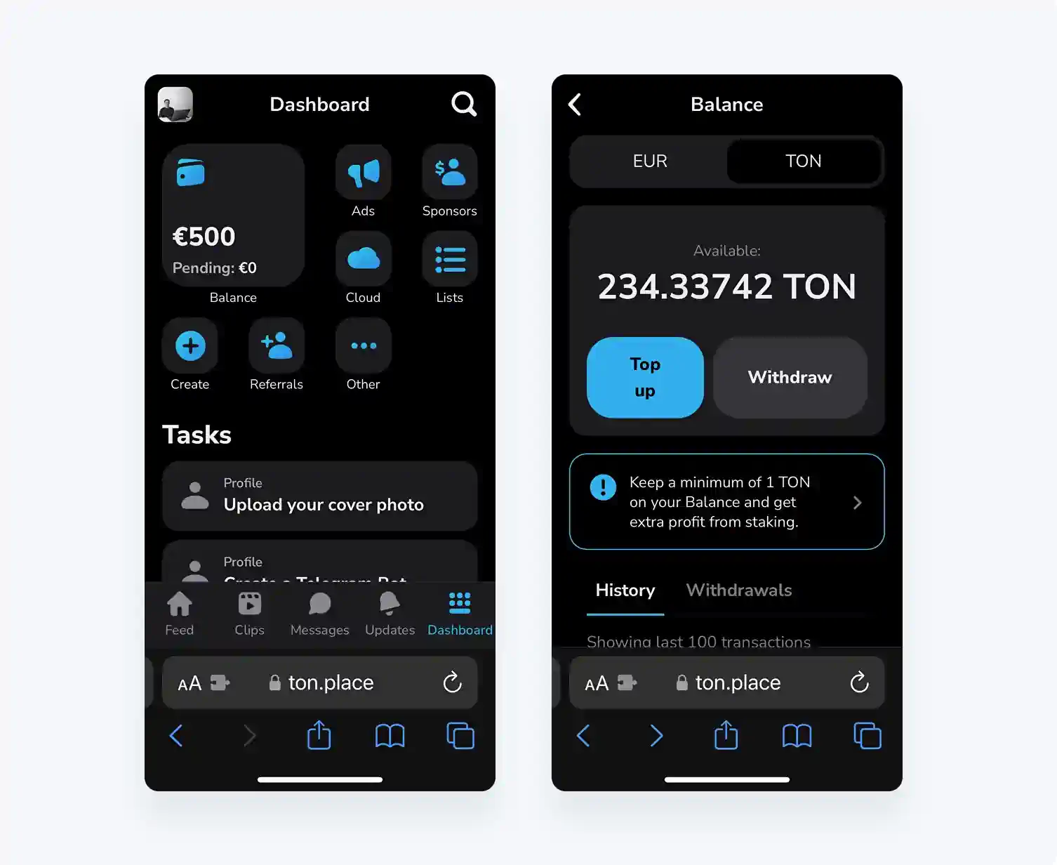 Для вывода евро надо обменять внутри Ton.Place на криптовалюту Toncoin (Ton) и отправить на свой криптокошелек.