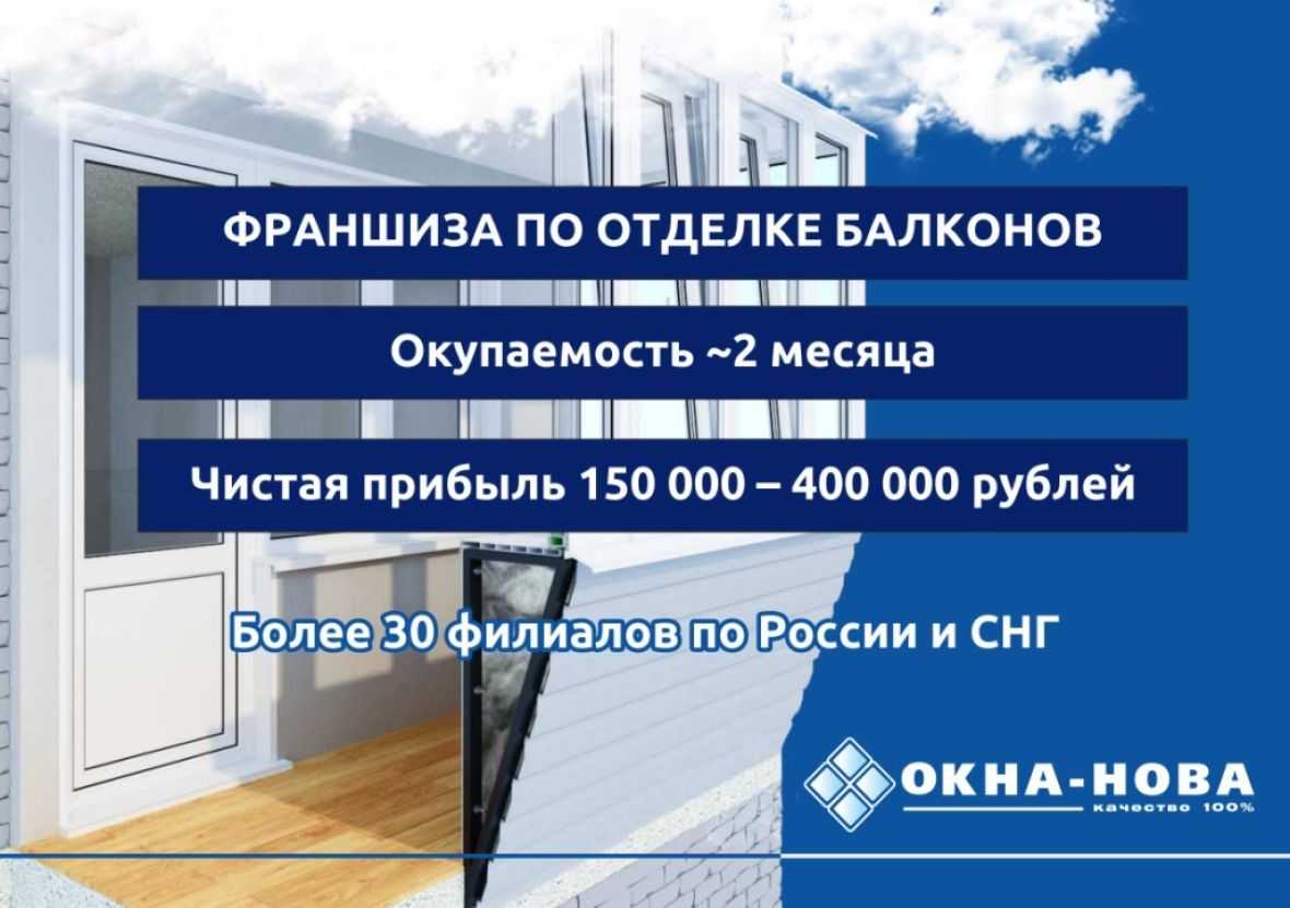 Компания «Окна-Нова» предлагает недорогую и быстро окупаемую франшизу ремонта балконов. Наш стаж работы составляет более десяти лет. Партнерам предлагается быстрый запуск бизнеса, начиная с обучения до полной ежедневной поддержки специалистами. При этом вложения минимальные – не более 250 000 рублей, роялти со второго месяца. Окупаемость вложенных средств в среднем стоит ожидать через два месяца.