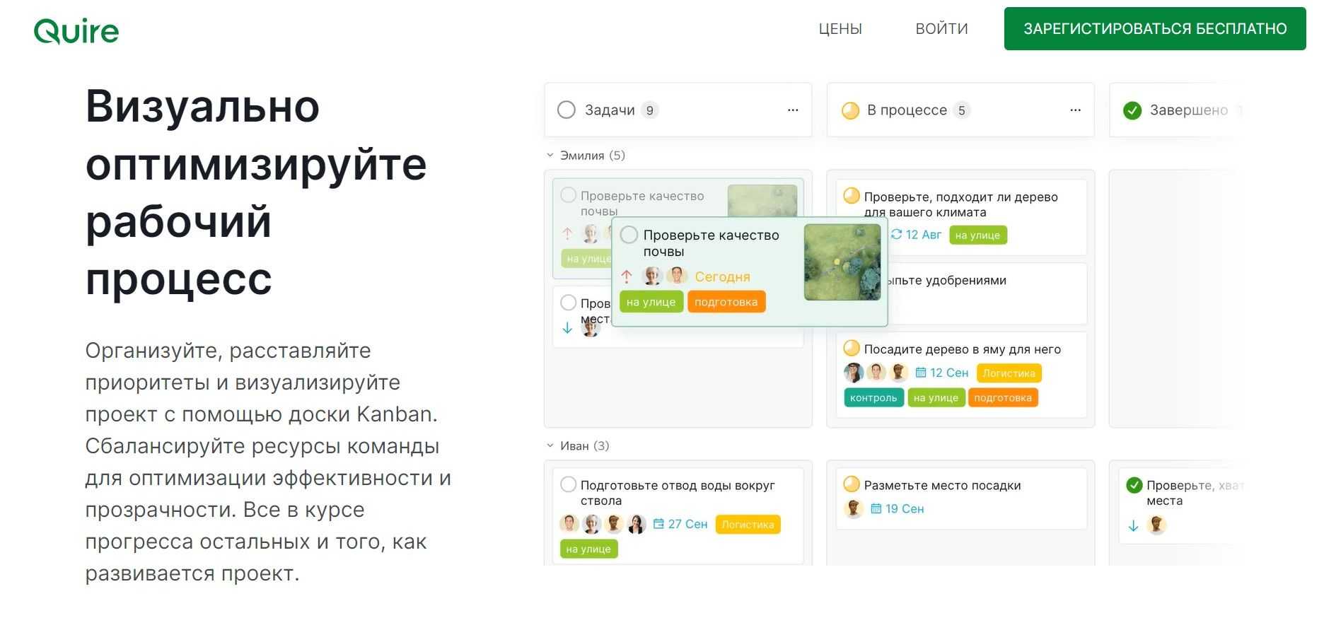 - Канбан-доска, список задач и календарь.