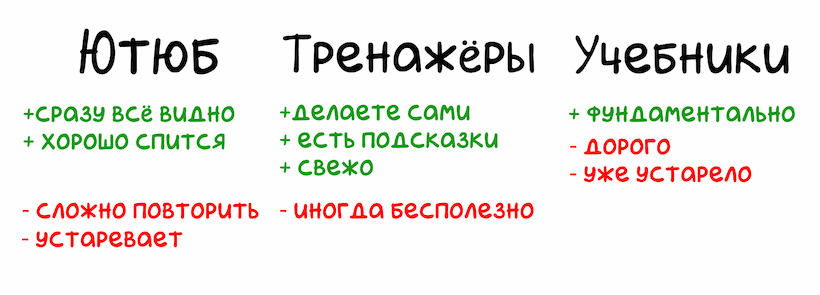 Сначала будет много непонятных слов, аббревиатур и голова пойдёт кругом. В одном JavaScript десятка три направлений, поэтому нужно понять, ваше ли это вообще. Смотрите видео на Ютубе или тренируйтесь на тренажёрах. Другой вариант — по учебникам, но с ними сложнее всего.