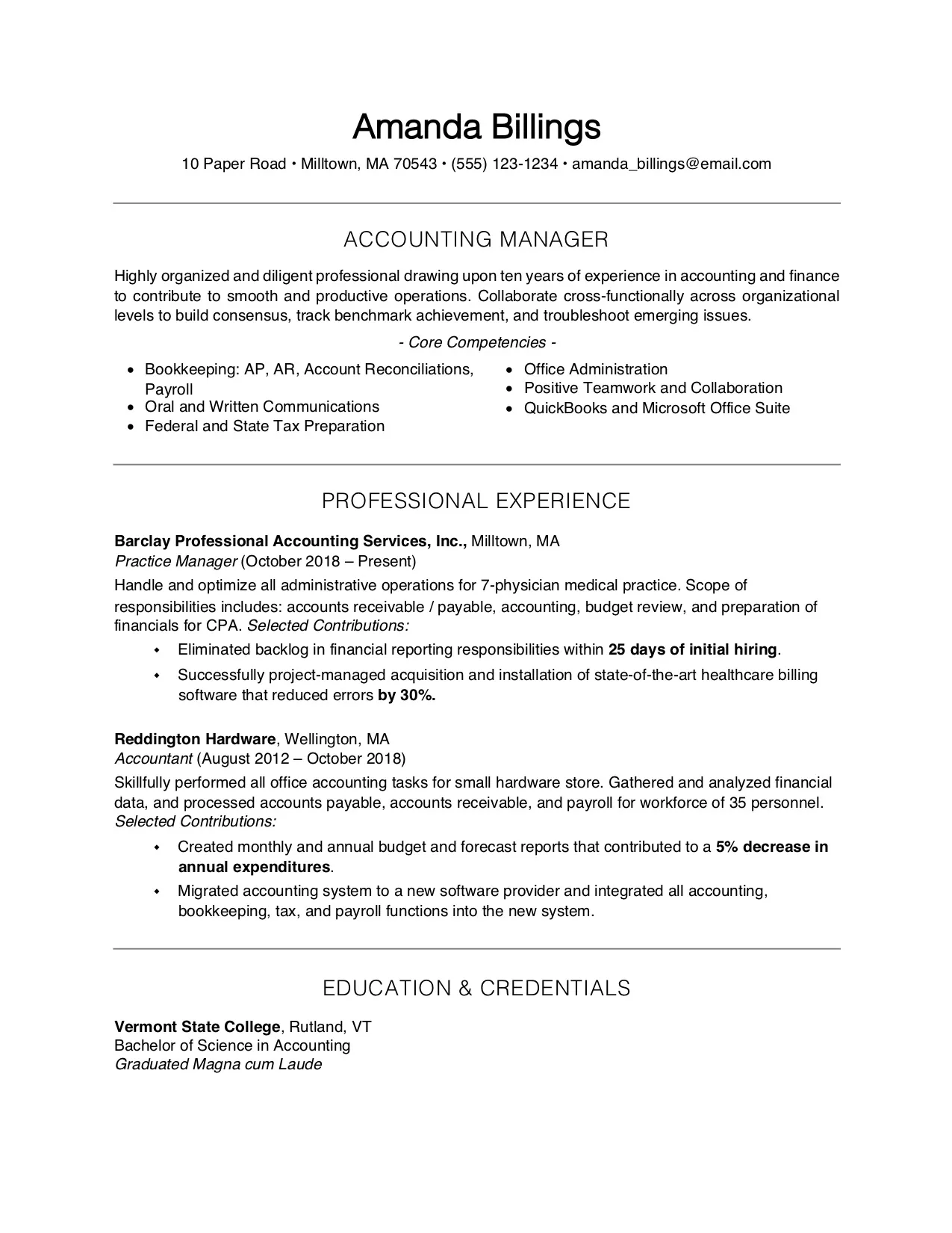 Reddington Hardware – Wellington, MAAccountant, August 2012 to October 2018Skillfully performed all office accounting tasks for a small hardware store. Gathered and analyzed financial data, and processed accounts payable, accounts receivable, and payroll for workforce of 35 personnel. Selected Contributions:
