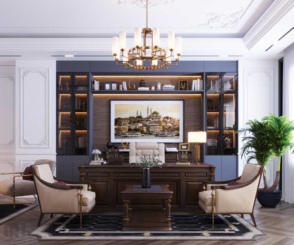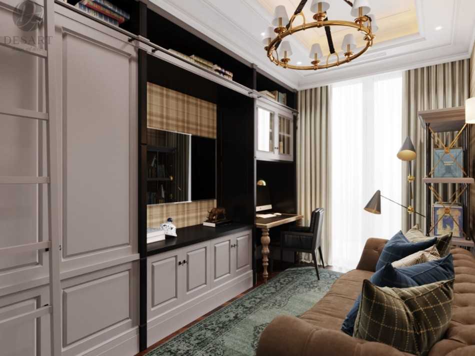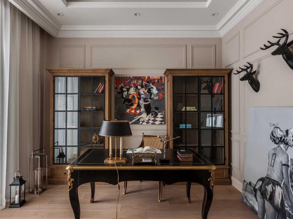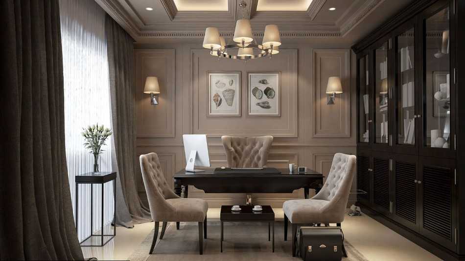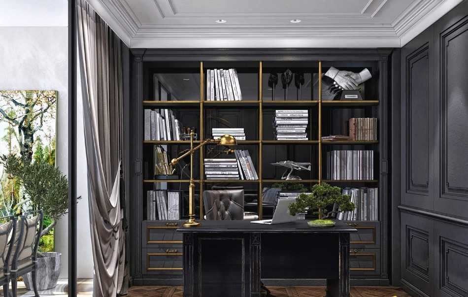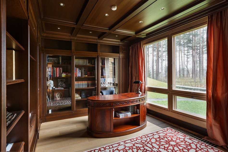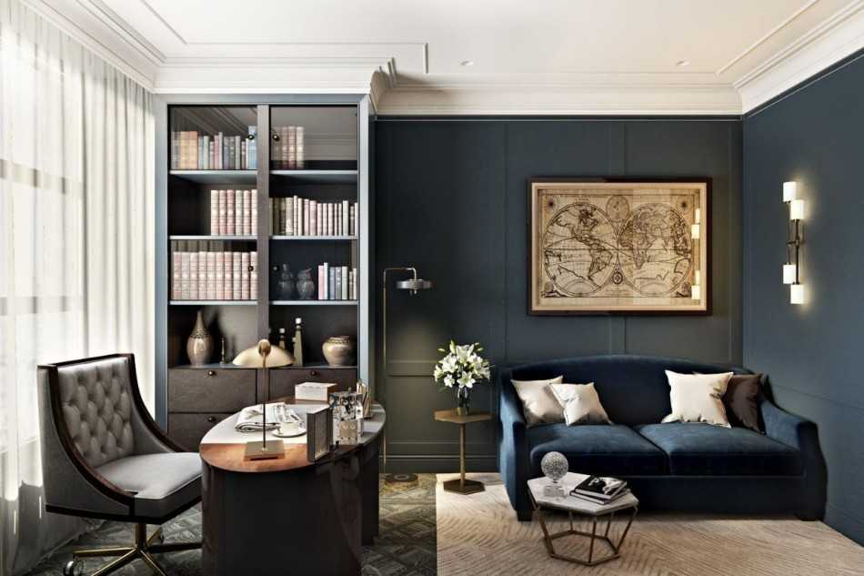 Этот стиль относится к традиционному. Основной принцип классики — симметрия и умеренное количество деталей. Обычно классический интерьер построен вокруг основного предмета, например, стола. Книжный шкаф и зона отдыха встают вокруг или в зеркальном отражении.