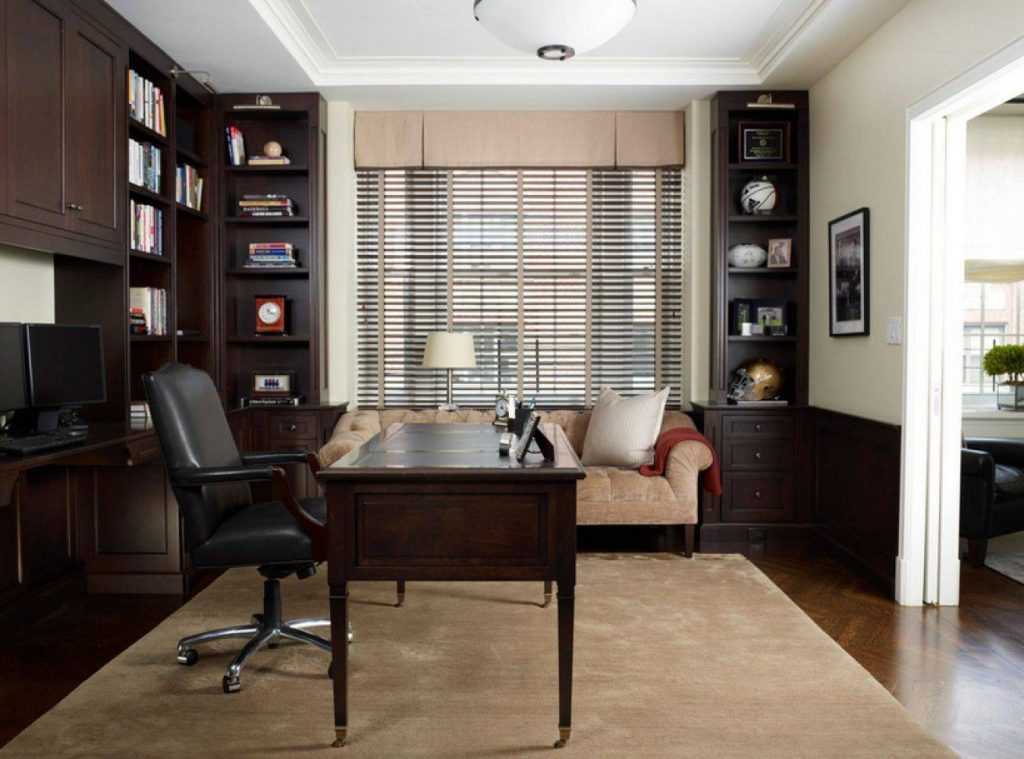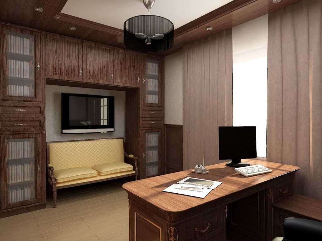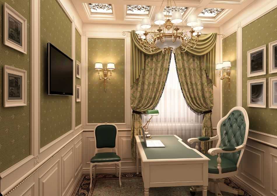 В цветовой схеме должны преобладать теплые глубокие тона, мебель лучше подбирать кожаную либо с бархатной обивкой, в креслах желательны мягкие плавные линии. Еще одна черта классического дизайна кабинета в квартире — светильники и люстры, соответствующие обстановке.