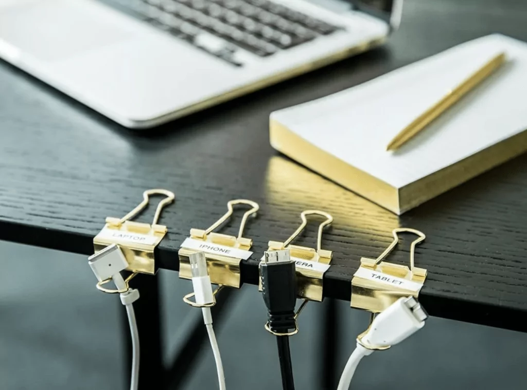 Крепления для проводов. Не поверите, сколько полезного места освобождается на вашем столе и под ним, когда все провода аккуратно закреплены. Можно воспользоваться лайфхаком: использовать зажимы для бумаги. Прикрепите их к краю стола, а все провода аккуратно проденьте в ушки.