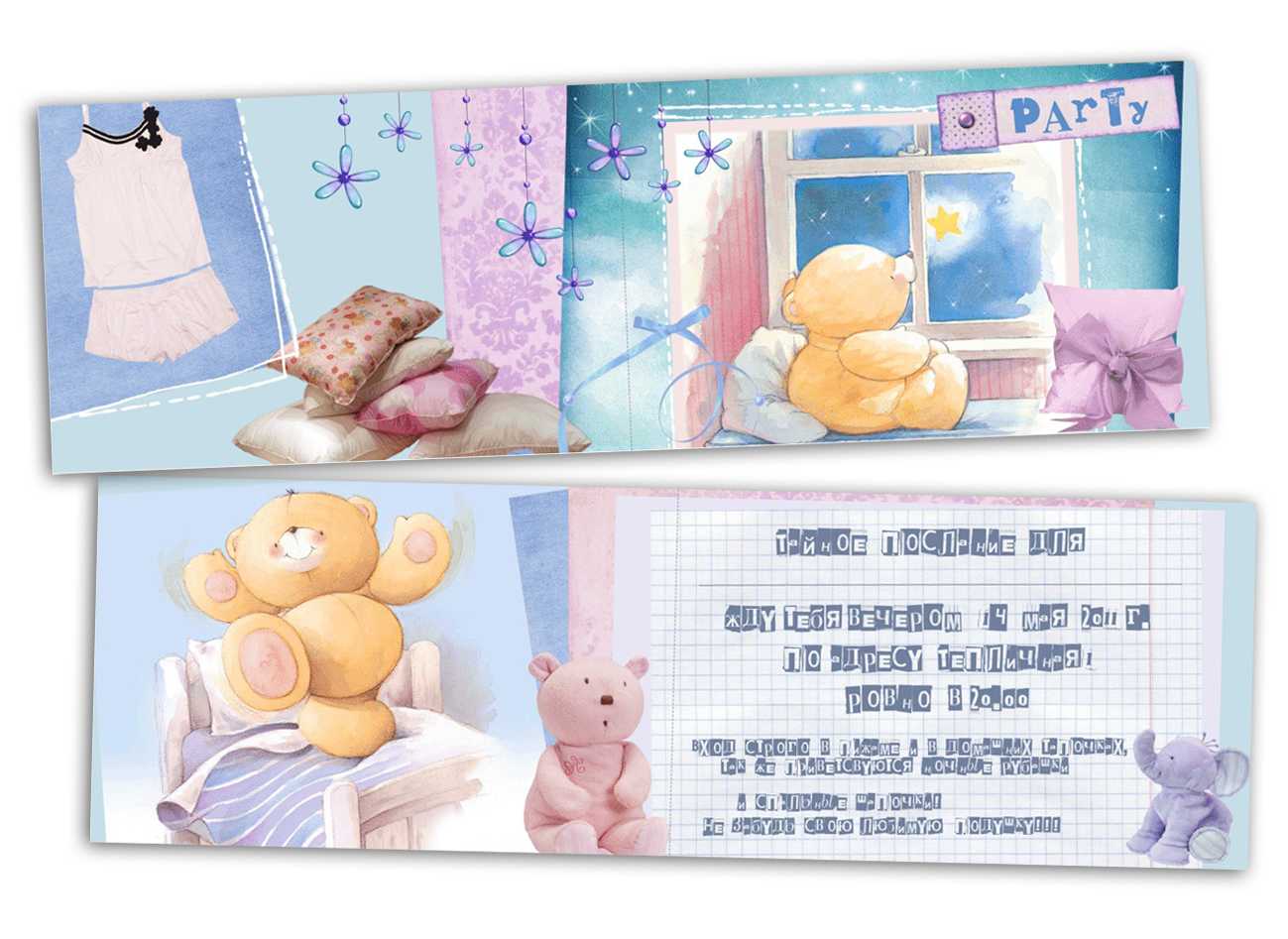 На первый взгляд, такой вариант приглашения может кому-то показаться детским и неприемлемым. Но на самом деле на пижамную вечеринку пригласительный и должен иметь такой «мимишный» вид и стиль. Если в вашей компании будут одни девчонки, тогда можете смело брать данный шаблон для себя.