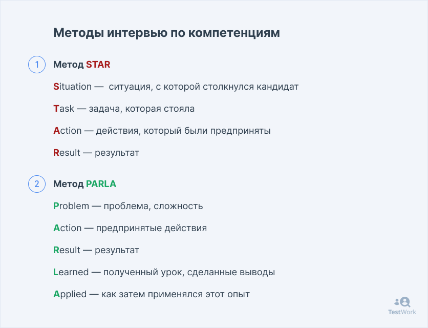 Формулировать вопросы для интервью можно методами STAR и PARLA. Первый актуален для уточнения опыта соискателя, второй — сфокусирован на развитии