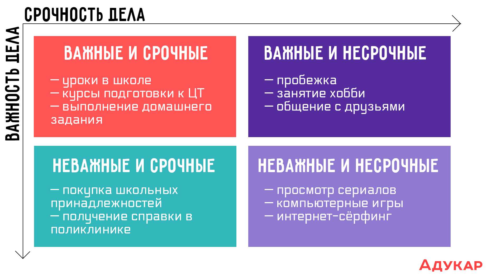 Постарайся максимально себя разгрузить. Осваивай тайм-менеджмент, дели «слонов» и ешь «лягушек» с утра. Составляй списки дел, отмечая их как срочные/несрочные и важные/неважные. Расставляй приоритеты, чтобы не оставлять на последний момент сверхважные дела.