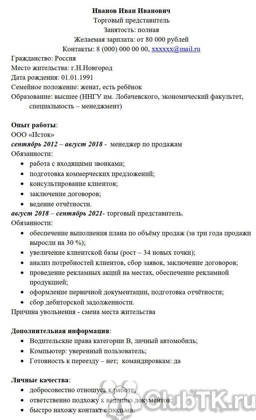 То же касается опыта работы. Допустим, вы участвуете в конкурсе на вакансию «Администратор торгового зала». Вряд ли работодателя заинтересует факт, что в течение двух лет вы выполняли письменные переводы. Соответственно, этот пункт в резюме включать не обязательно. (В CV вы бы его упомянули).