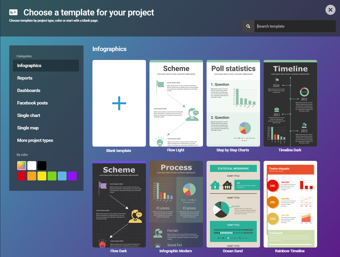 Проект имеет несколько тарифных планов: базовый бесплатный – самый ограниченный по функциям, однако и их может хватить для ваших задач. Шаблонов много (хотя не все доступны на бесплатном тарифе), есть варианты не только для инфографики, но и для отчетов, отдельных диаграмм и даже постов в Facebook.