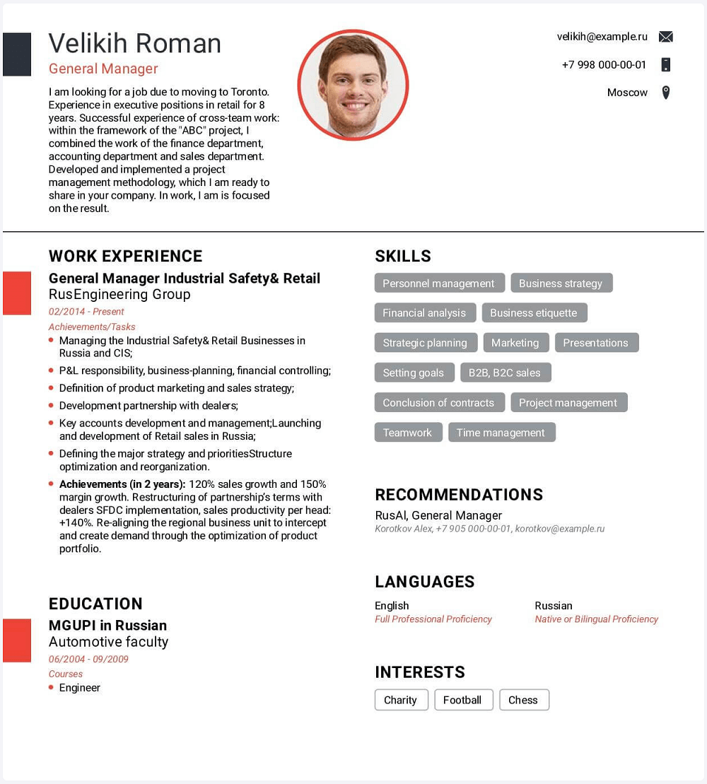 Пример англоязычного резюме топ-менеджера в Novoresume